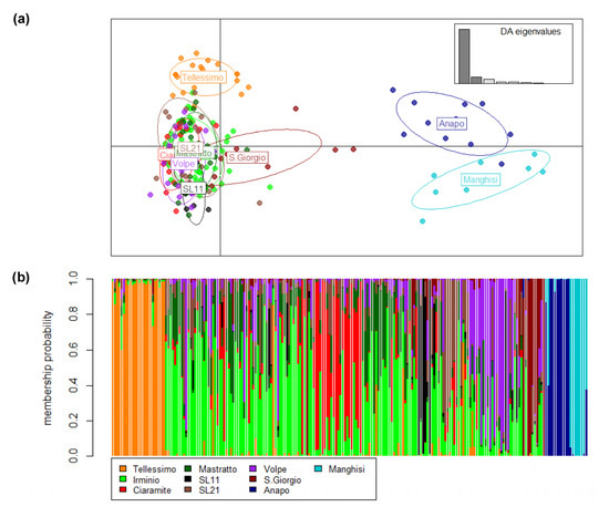 - Jombart, T.; Devillard, S.; Balloux, F. Discriminant Analysis of Principal Components: A New Method for the Analysis of Genetically Structured Populations. BMC Genet. 2010, 11, 94. [Google Scholar] [CrossRef]