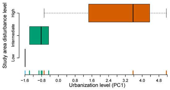 Level of human disturbance across study areas. Initial designation of human disturbance included three categories based on our observations (high, intermediate, low levels of disturbance). Principal component axis 1 (PC1) combines different metrics of human disturbance across study areas (see Table 2). Colored ticks along the x-axis indicate actual PC1 scores of each study area (some study areas within a human disturbance category have the same PC1 score).