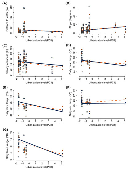 Effects of urbanization level for natural (blue circles, solid lines) and artificial (orange squares, dashed lines) nests on microhabitat variables. (A) Distance of nests from the edge of water of the nearest pond. (B) Ground slope around nest sites. (C) Canopy openness over nests. (D) Daily mean nest temperature. (E) Daily maximum nest temperature. (F) Daily minimum nest temperature. (G) Daily temperature range.
