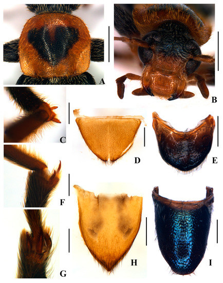 Osphya sinensis sp. n. (A–C,E–G,I) male; (D,H) female: (A) pronotum, dorsal view; (B) head, frontal view; (C) protibial spurs, dorsal view; (D,E) abdominal ventrite V, ventral view; (F) mesotibial spurs, lateral view; (G) metatibial spurs, dorsal view; (H,I) abdominal tergite V, dorsal view. Scale bars (A,B) 1.0 mm; (D–E,H,I) 0.5 mm; (C,F,G) 0.2 mm.