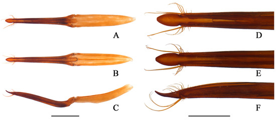 Osphya sinensis sp. n. (A–C) the whole of the aedeagus; (D–F) the apical half part of the aedeagus. (A,D) dorsal view; (B,E) ventral view; (C,F) lateral view. Scale bars (A–C) 1.0 mm; (D–F) 0.5 mm.