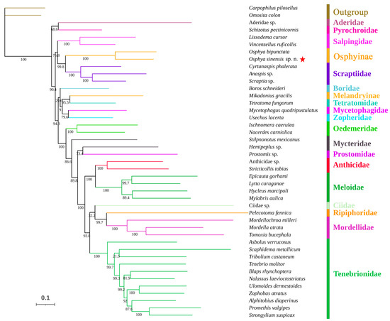 Phylogenetic tree of Tenebrionoidea produced from the ML analysis based on 13 PCGs (BS values indicated in each clade). The red star denotes Osphya sinensis sp. n.