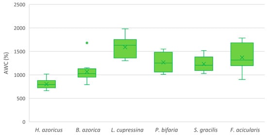 Within Marchantiophyta (Figure 1), Herbertus azoricus and Lepidozia cupressina showed the lowest and highest value of AWC, respectively, and these values were significantly different (p < 0.05) from all other liverworts.