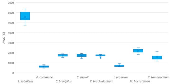 Within Bryophyta (Figure 2), the moss Sphagnum subnitens (class Sphagnopida) presented the highest ability to hold water ranging from 4752% to 6354% while the moss Polytrichum commune (class Polytrichopsida) showed the lowest ability to hold water, showing a range of values from 481% to 825%. Within class Bryopsida, the pleurocarpous mosses Isothecium prolixum and Myurium hochstetteri presented, respectively, the lowest and the highest AWC values, which were always significantly different (p < 0.05) from the AWC of the remaining species. In fact, the moss Myurium hochstetteri (AWC = 2201% dw) exhibited the second highest value of AWC, following Sphagnum subnitens, although presenting less than half of S. subnitens’ water-holding ability.
