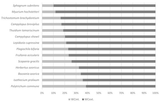 Within class Jungermanniopsida, Herbertus azoricus, and Bazzania azorica presented the lowest and highest wCint., respectively. Regarding wCext. the minimum value was also registered for Herbertus azoricus, while the maximum was achieved by Lepidozia cupressina (Table 2). Among the species of class Bryopsida, Myurium hochstetteri, and Campylopus shawii presented the lowest and highest wCint., respectively. The minimum wCext. was recorded for Isothecium prolixum while Myurium hochstetteri showed the maximum value (Table 2).