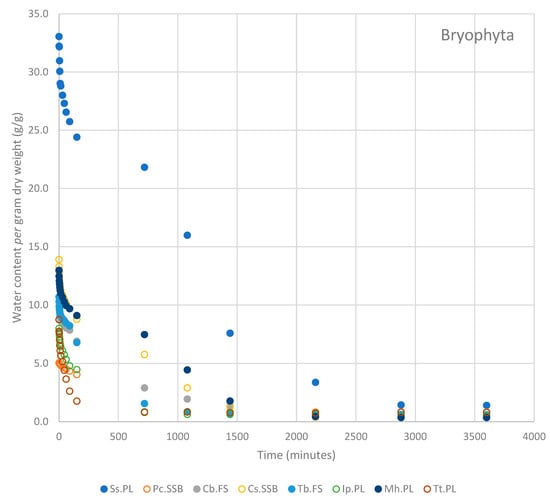 When subject to air temperature (21 °C ± 1 °C) and ambient room relative humidity (55% ± 5%), the water content of the selected bryophyte species showed, for most of them, an exponential decay curve along time (Figure 4).