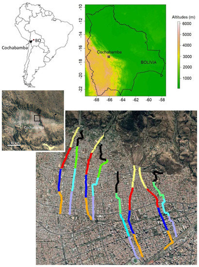 Cochabamba in Bolivia (BO, South America) is located at an altitude of 2570 m a.s.l. The studied corridors begin on the border of the National Park of Tunari (750 m long sections; natural corridors: yellow, red, blue, and orange; sections of artificial corridors: black, green, light-blue, and purple).