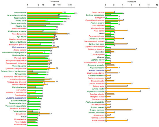 Total counts of tree species individuals in artificial (orange) and natural (green) sections, with color of species names indicating status (green: native; red: cultivated; blue: cultivated/naturalized; black: unknown).