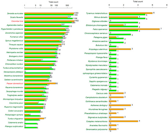 Total counts of bird species individuals in the natural (green) and artificial (orange) sections, with the color of the species names indicating status (green: native; red: introduced).
