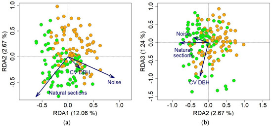 Projections of bird communities in the natural (green) and artificial (orange) sections in constrained spaces: (a) RDA1 and RDA2, (b) RDA2 and RDA3, with vectors showing the direction and the intensity of the three selected explanatory factors.