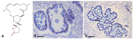 - Avila, C.; Durfort, M. Histology of Epithelia and Mantle Glands of Selected Species of Doridacean Molluscs with Chemical Defensive Strategies. Veliger-Berkeley- 1996, 39, 148–163. [Google Scholar]