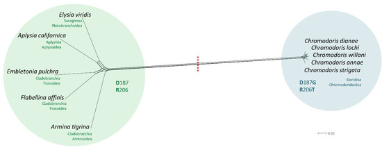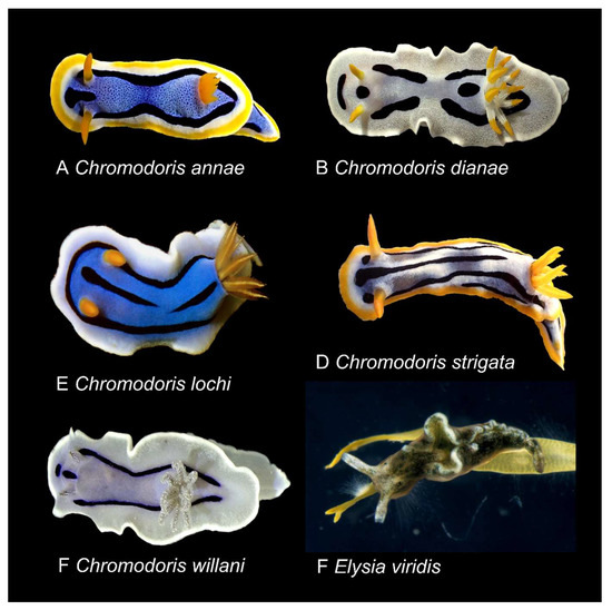 - Johnson, R.F.; Gosliner, T.M. Traditional Taxonomic Groupings Mask Evolutionary History: A Molecular Phylogeny and New Classification of the Chromodorid Nudibranchs. PLoS ONE 2012, 7, e33479. [Google Scholar] [CrossRef]