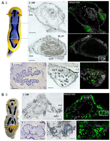 - Hamilton, B.R.; Chan, W.; Cheney, K.L.; Sullivan, R.K.P.; Floetenmeyer, M.; Garson, M.J.; Wepf, R. Cryo-Ultramicrotomy and Mass Spectrometry Imaging Analysis of Nudibranch Microstructures. J. Am. Soc. Mass Spectrom. 2022, 33, 592–597. [Google Scholar] [CrossRef]
