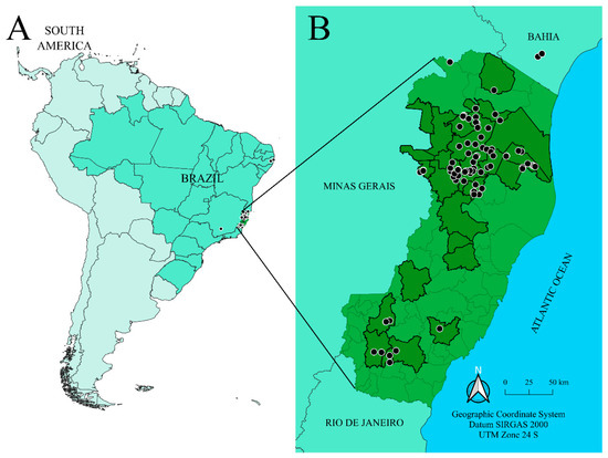 Oliveira, P.V.; dos Santos, A.R.; Olive, E.L.; Britto, K.B.; de Almeida, F.A.N.; Pacheco da Silva, V.C.; Machado, C.B.; Fornazier, M.J.; Ventura, J.A.; Culik, M.P.; et al. Molecular Species Delimitation Using COI Barcodes of Mealybugs (Hemiptera: Pseudococcidae) from Coffee Plants in Espírito Santo, Brazil. Diversity 2023, 15, 305. https://doi.org/10.3390/d15020305