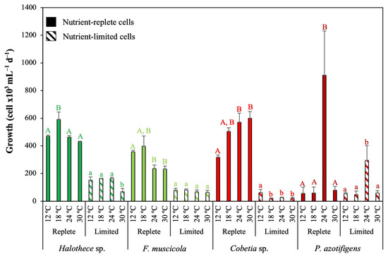 Temperature effect on growth after 72 h under different nutrient concentrations. Values are the mean ± SE (n = 3). Letters (i.e., capital letters or lower case) indicate significant differences (p < 0.05) with the rest of the treatments for each strain and nutrient level, using a post hoc test (Bonferroni’s test) after ANOVA over the whole dataset.