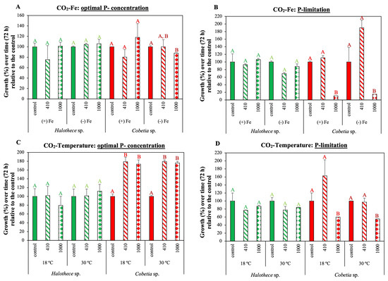 Growth (calculated as % difference relative to the control over the incubation time of 72 h) after the exposure to atmospheric CO2 (aCO2, 410 ppm) and elevated CO2 (eCO2, 1000 ppm). Effect of CO2 exposure on growth at different concentrations of Fe (+Fe, 1 µM and −Fe, 2 nM) under (A) P-optimal conditions (1.5 mM) and (B) P-limitation (0.1 µM). Exposure to CO2 at different temperature levels (18 °C and 30 °C), under (C) P-optimal conditions, and (D) P- limitation. In (C,D), cultures were incubated under 1 µM of Fe. Values are the mean ± SE (n = 3). Letters indicate significant differences (p < 0.05) with the rest of the treatments for each strain and experimental set-up, using a post hoc test (Bonferroni’s test) after ANOVA over the whole dataset.