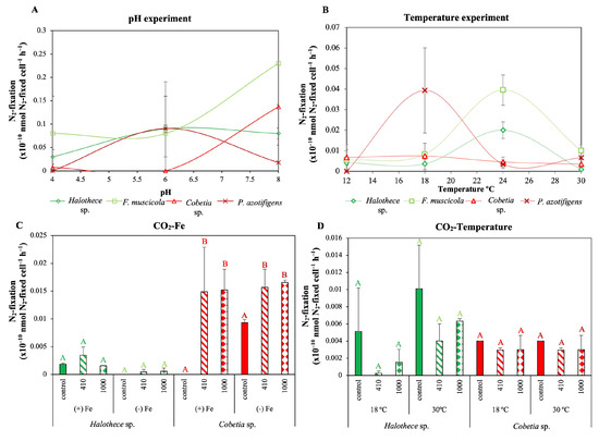 Effect of global climate change factors on N2-fixation rates. Effect of (A) pH (4–8) and (B) temperature levels (12–30 °C) on N2 fixation rates after 72 h (as line plots). (C,D) Effect of different concentrations of CO2 (control, atmospheric CO2 (aCO2): 410 ppm, and elevated CO2 (eCO2): 1000 ppm) in combination with different (C) Fe (+Fe, 1 µM and −Fe, 2 nM) and (D) temperature levels (18 °C and 30 °C). All treatments were incubated under optimal P-concentration to detect N2-fixation rates. Values are the mean ± SE (n = 3). Letters indicate significant differences (p < 0.05) with the rest of the treatments for each strain and experimental set-up, using a post hoc test (Bonferroni’s test) after ANOVA over the whole dataset.