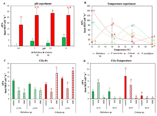 Effect on P-acquisition mechanisms (alkaline phosphatase activity [APA]), after 72 h, under different (A) pH (6.5–8) and (B) temperature levels (12–30 °C) as a line plot, and (C,D) different concentrations of CO2 (control, atmospheric CO2 (aCO2): 410 ppm, and elevated CO2 (eCO2): 1000 ppm) in combination with different (C) Fe (+Fe, 1 µM and −Fe, 2 nM) and (D) temperature levels (18 °C and 30 °C). The measurements were taken under P limitation (0.1 µM) to induce APA. Note that for the pH experiment, APA was only measured in Halothece sp. and Cobetia sp. in a pH range between 6.5–8. Values are the mean ± SE (n = 3). Letters indicate significant differences (p < 0.05) with the rest of the treatments for each strain and experimental set-up, using a post hoc test (Bonferroni’s test) after ANOVA over the whole dataset.