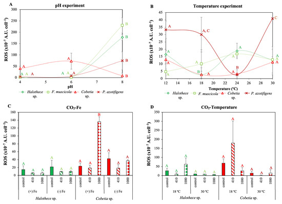 Reactive oxygen species (ROS) production after 72 h, under different (A) pH and (B) temperature levels, and (C,D) different concentrations of CO2 (control, atmospheric CO2 (aCO2): 410 ppm, and elevated CO2 (eCO2): 1000 ppm) in combination with different (C) Fe (+Fe, 1 µM and −Fe, 2 nM) and (D) temperature levels (18 °C and 30 °C). All treatments were incubated under optimal P-condition. Values are the mean ± SE (n = 3). Letters indicate significant differences (p < 0.05) with the rest of the treatments for each strain and experimental set-up, using a post hoc test (Bonferroni’s test) after ANOVA over the whole dataset.