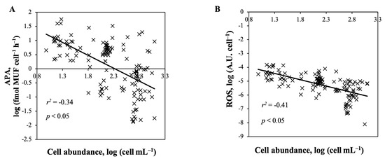 Linear regression analyses between (A) cell abundance and ROS per cell and (B) cell abundance and APA per cell. All treatments and species from the pH, temperature, and CO2 experiments were combined.