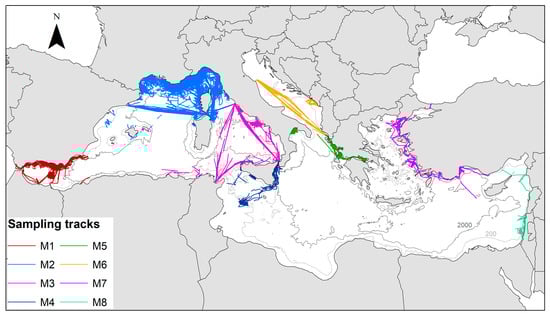 - Mannocci, L.; Roberts, J.J.; Halpin, P.N.; Authier, M.; Boisseau, O.; Bradai, M.N.; Cañadas, A.; Chicote, C.; David, L.; Di-Méglio, N.; et al. Assessing cetacean surveys throughout the Mediterranean Sea: A gap analysis in environmental space. Sci. Rep. 2018, 8, 3126. [Google Scholar] [CrossRef]