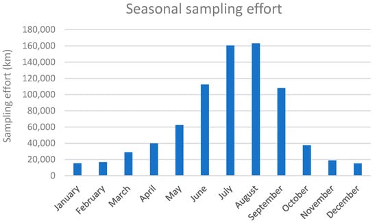 Furthermore, the data analysed refer mainly to the spring–summer period (see Figure 2), as this is the best period for data collection in terms of weather condition and daylight hours. The general picture could change if referring to different seasons, especially for highly mobile species such as the fin whale [].