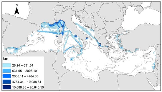 As the effort performed by the category A vessels across the whole basin was far greater (A = 495,822 km; B = 58,329 km; C = 245,886 km), we normalized the effort of the category B to A in subzone M1 (where the effort performed by the two types of platforms was almost the same, see Figure S13 of the Supplementary Materials) to make the encounter rate comparable across the study areas.