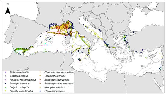 At present, the regular presence of nine species of cetaceans, all of Atlantic origin, is reported by the monitoring and research campaigns that have been conducted in the area []. Among odontocetes, the striped dolphin (Stenella coeruleoalba), the common bottlenose dolphin (Tursiops truncatus), the common dolphin (Delphinus delphis), the Risso’s dolphin (Grampus griseus), the long-finned pilot whale (Globicephala melas), and the rough-toothed dolphin (Steno bredanensis), belonging to the family Delphinidae, as well as the Cuvier’s beaked whale (Ziphius cavirostris) and the sperm whale (Physeter macrocephalus), belonging to the family Ziphiidae and Physeteridae respectively, are considered resident alongside the fin whale (Balaenoptera physalus), belonging to the family Balaenopteridae, which is the only regularly sighted mysticete. Four more species, namely, the killer whale (Orcinus orca), the false killer whale (Pseudorca crassidens), the minke whale (Balaenoptera acutorostrata), and the humpback whale (Megaptera novaeangliae), are considered occasional visitors to the Mediterranean basin [,,,,,].