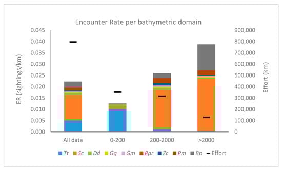 Analysing the whole dataset (“All data” column in Table 2), the four most sighted species (striped dolphin, bottlenose dolphin, fin whale, and sperm whale) account for about 91% of sightings. Particularly, on the continental shelf (0–200 m), only two species (bottlenose dolphin and striped dolphin) represent about 91% of sightings; on the continental slope (200–2000 m), five species (striped dolphin, sperm whale, fin whale, bottlenose dolphin, and common dolphin) account for about 92%, while in the pelagic waters (>2000 m), the sightings of the striped dolphin and fin whale account for about 90%. In Figure 5, the ER of the species in the bathymetric domains is reported, together with the respective sampling effort. The total ER is lowest on the continental shelf (0–200 m) and highest in pelagic waters >2000 m. The continental slope (200–2000 m) shows a more equal composition of species, suggesting a higher diversity. In relation to the ER of individual species, the bottlenose dolphin and the striped dolphin prevail on the continental shelf (0–200 m) and on the offshore domains (200–2000 m; >2000 m), respectively; the fin whale shows a clear preference for pelagic waters >2000 m; while the sperm whale is sighted with similar ER both on the continental slope (200–2000 m) and in pelagic waters (>2000 m).