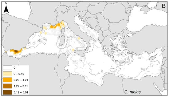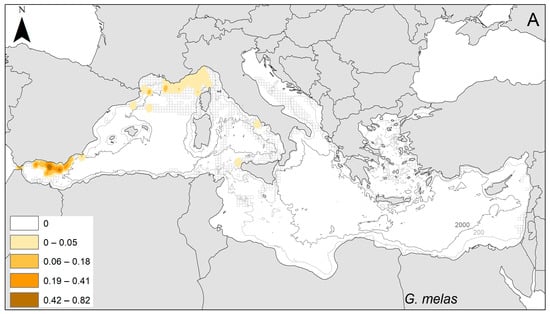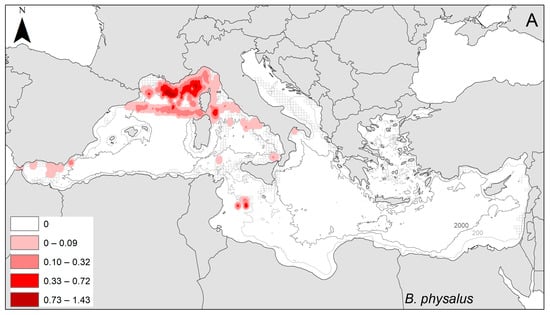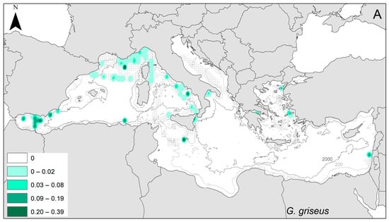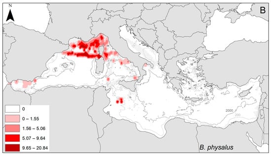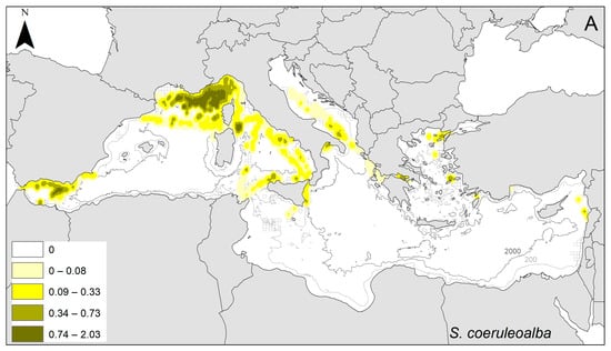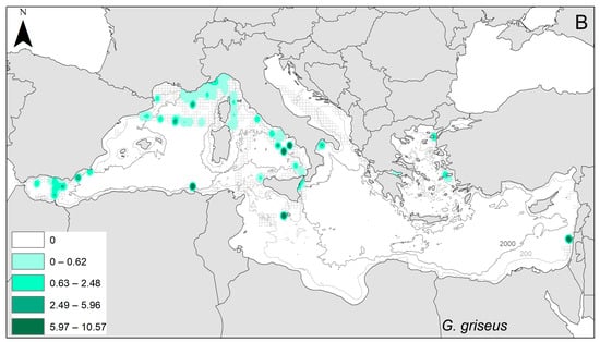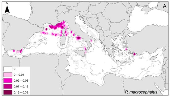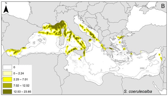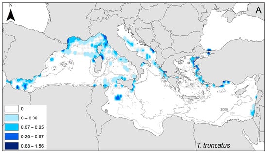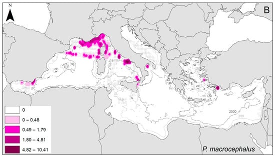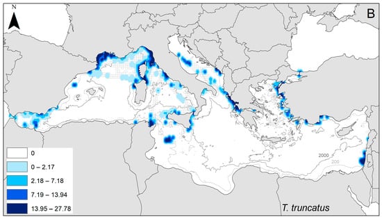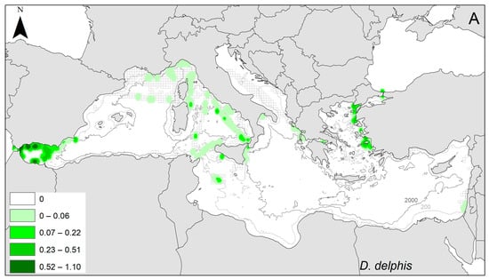 The diversity map, elaborated through the Shannon index (Figure 14B), is quite consistent with the map of the encounter rate, at least in the general pattern; the diversity index is at a maximum in the Alboran Sea and seems to decrease moving eastwards in the Mediterranean. At the same time, the diversity index shows the lowest values in the domain of the continental shelf, which is dominated by the bottlenose dolphin, except for the Alboran Sea and the Aegean Sea, where the distribution of the common dolphin partially overlaps the distribution of the bottlenose dolphin, in agreement with previous studies [,,,]. All of the other species seem to find their habitat outside the continental shelf, where the greatest bathymetric gradient allows them to find the most favourable ecological conditions, in terms of presence and abundance of prey too, again in agreement with previous findings [,,,,,].
