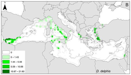 The encounter rate map (A) and the prevalence map (B) of the striped dolphin (Stenella coeruleoalba), processed through Kernel density analysis. The striped dolphin was sighted in all areas of sampling, with a clear preference for the waters outside the continental shelf (>200 m), even very close to the coastline and in semi-closed contexts, provided there was the right water depth (such as in the Gulf of Corinth, Greece). Its ER is higher in the western basin, specifically in the Alboran Sea and in the north-western Mediterranean. The striped dolphin shows a high prevalence in most of the sampled offshore waters (B), confirming its status as a dominant species of the offshore domains. However, in the Alboran Sea, its prevalence is relatively low (despite the high ER), probably due to the coexistence of other species (Kernel density parameters: cell size x, y = 5 × 5 km; radius ≈ 30 km; criterion for division into classes: natural breaks).