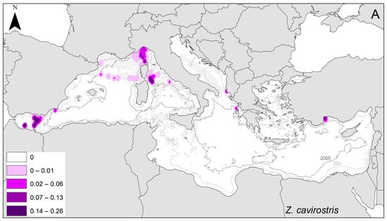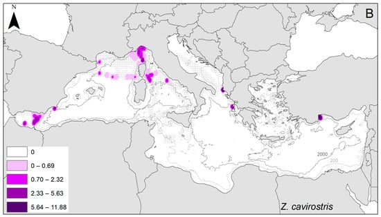 The encounter rate map (A) and the prevalence map (B) of the Cuvier’s beaked whale (Ziphius cavirostris), processed through Kernel density analysis. The Cuvier’s beaked whale was only sighted in some of the sampled areas, mainly (but not only) in the western basin. The ER is maximum in the Alboran Sea, in the central portion of the Pelagos Sanctuary, and in a few relatively small areas such as in the northeast of Sardinia (the so-called canyon system of Caprera, Italy) and in the Bay of Antalya (Türkiye). This species shows a clear preference for waters outside the continental shelf (>200 m) and a slight preference for the waters of the continental slope (200–2000 m). The prevalence map (B) confirms this pattern of presence and distribution limited to a few specific areas (Kernel density parameters: cell size x, y = 5 × 5 km; radius ≈ 30 km; criterion for division into classes: natural breaks).