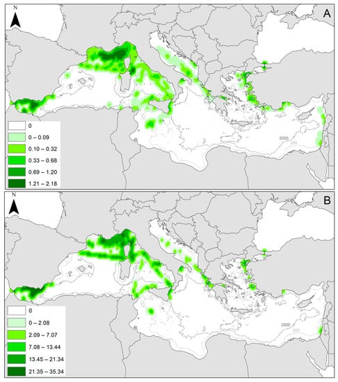 The encounter rate map (A) and the prevalence map (B) of the common dolphin (Delphinus delphis), processed through Kernel density analysis. The common dolphin was sighted in most of the areas sampled (except for the Adriatic Sea), with a very diverse and ubiquitous distribution. Its ER is maximum in the Alboran Sea, where this species seems to find its favoured habitat in the waters of the continental shelf and slope. In the Ligurian and Tyrrhenian Sea, its ER is much lower, and this species seems to prefer the open waters outside the continental shelf (>200 m). In the Aegean Sea, the ER increases and the common dolphin seems to find its privileged habitat at the upper edge of the continental slope, close to the platform. The prevalence map (B) shows an inverse pattern to that of the striped dolphin (Figure 6B), with prevalence levels increasing from north to south and from west to east (Kernel density parameters: cell size x, y = 5 × 5 km; radius ≈ 30 km; criterion for division into classes: natural breaks).