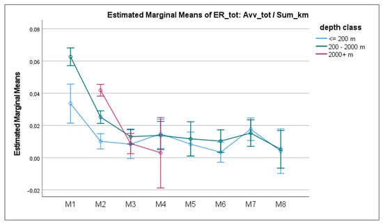 The overall encounter rate was analysed through a GLM with survey effort as a covariate and subzone and depth class as factors (Figure 15). The effort covariate was not found to be significant (p-value > 0.05), while geographical subzones (F: 23.2, df1: 7, df2: 854), depth class (F: 5.6, df1: 2) and their interaction (F: 6.2, df1: 9) were all found to be highly significant (p-value: 0.001). The ER in subzone M1 was found to be significantly higher than in all other subareas, both on the continental shelf (0–200 m) and along the continental slope (200–2000 m). The M2 subzone was found to have an ER higher than the M3 and M4 subzones in the pelagic domain (>2000 m) and subzones M3, M6, and M8 along the continental slope (200–2000 m). In all the other subzones, the differences were not significant.