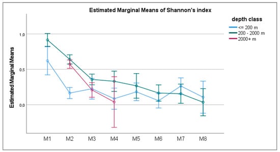 Regarding the Shannon index (Figure 16), the GLM analysis results showed effort to be a significant covariate (F: 65.6, df1: 1, df: 854—p-value < 0.001), as with the factors depth class, subzone, and their interaction (p-value < 0.001). The subzone was found to be the most significant factor (F: 21.6, df1: 7) with respect to the depth class (F: 8.4, df1: 7) and the subzone * depth interaction (F: 6.9, df1: 9).