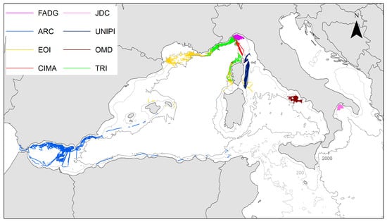 The data were collected by 32 research groups operating in the Mediterranean Sea over a period of 15 years (i.e. from 2004 to 2018). Most of the data were then shared on the web-GIS platform Intercet (https://www.intercet.it/, accessed 1 October 2022), while some were later included in the common dataset (see Table 1 for details). The investigated area includes the Alboran Sea; the Gulf of Lion and the Ligurian Sea; the Tyrrhenian Sea; the waters around Sicily and the Sicily Strait; the northern Ionian Sea, along the Italian and Greek coasts; the Adriatic Sea; the Aegean Sea, along the coast of Türkiye; the Turkish Straits System, consisting of the Marmara Sea, Istanbul, and Çanakkale Straits; and the eastern Mediterranean Sea, off the coast of Israel, Lebanon, and Syria (Table 1, Figure 1).
