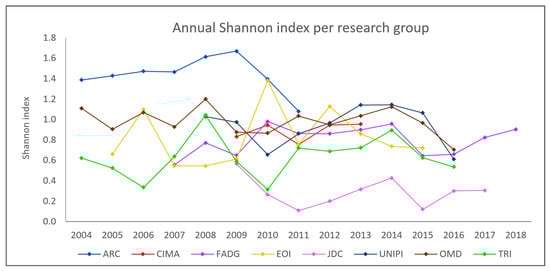 The Shannon index (usually denoted as H) is one of most popular indices used to measure the diversity of species []. The index is given by the following formula:
