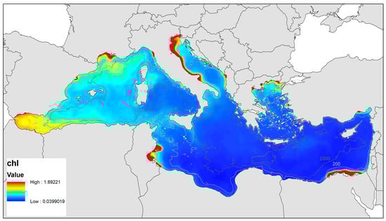 Chlorophyll concentration (mg.m−3) (average value for 2016). Data source: https://data.marine.copernicus.eu (accessed 20 December 2022).