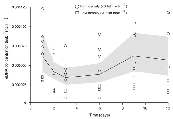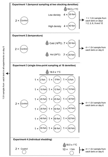 - Jo, T.; Murakami, H.; Yamamoto, S.; Masuda, R.; Minamoto, T. Effect of water temperature and fish biomass on environmental DNA shedding, degradation, and size distribution. Ecol. Evol. 2019, 9, 1135–1146. [Google Scholar] [CrossRef]