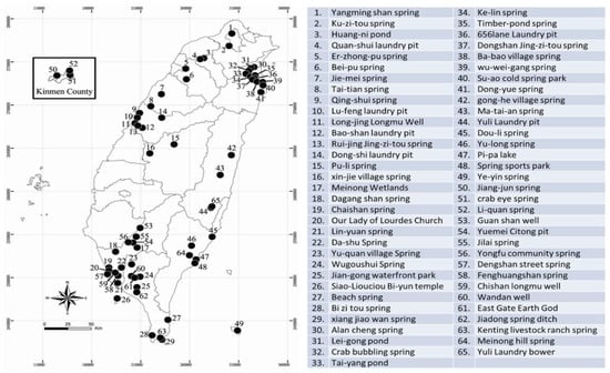 - Liang, S.H.; Chiu, Y.W.; Huang, D.J. Development of Sustainable Model and Assessment of Habitat Quality of Springs in Taiwan; Council of Aquaculture: Taipei, Taiwan, 2017. (In Chinese) [Google Scholar]