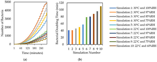 (a) Simulated temporal patterns of bacterial growth at decreasing temperatures and relative humidity. (b) Simulated doubling times for the same simulations as (a). Note that Simulation 1 and Simulation 2 results are nearly identical.