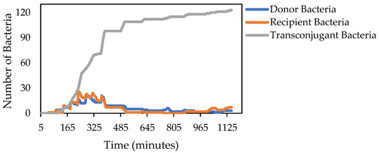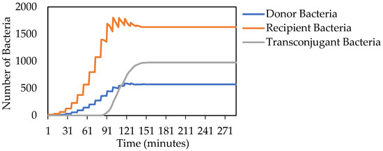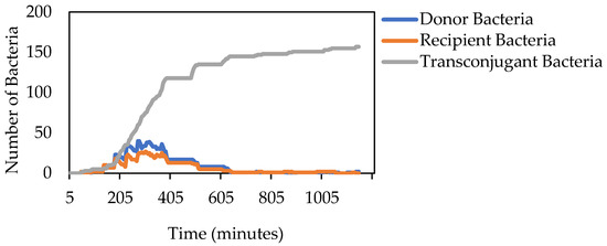 The same overall pattern is demonstrated in the experimental simulation (Figure 9) as the baseline (Figure 8), with slightly lower numbers of transconjugant and donor bacteria. Similar to the baseline trend, transconjugant bacterial levels rose on a steep curve until plateauing at around 600 min (10 h) at about 120 bacteria and remaining at those high levels for the remainder of the simulation. The donor bacteria and recipient bacteria exhibited similar patterns in that they both demonstrated a downwards facing parabola, peaking at around 305 min (about 5 h). The donor bacteria peaked at a slightly lower level (21 bacteria) compared with the recipient bacteria (26 bacteria) before returning to near zero around 650 min (10.83 h). This is expected because as B. thuringiensis could not conjugate, 1% of the initial bacterial population could not engage in conjugation, thus lowering the number of bacteria participating in the donation and transconjugation of plasmids.