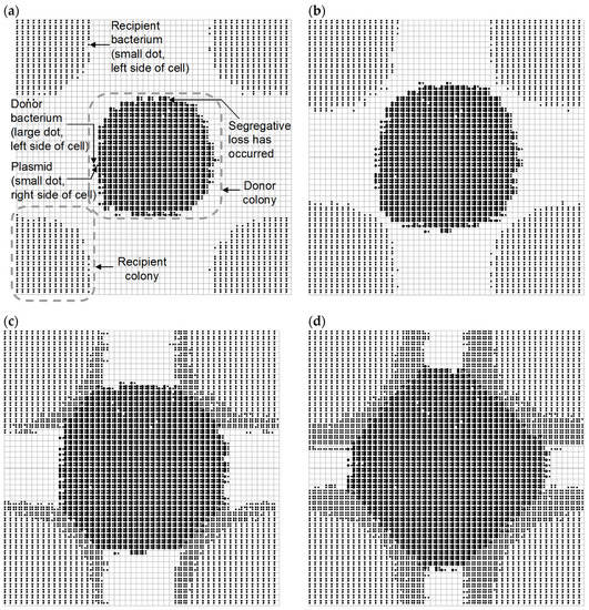 Results of simulated spatial patterns of bacterial conjugation and plasmid invasion of recipient colonies at 30 °C and 100% relative humidity: (a) after 10 h; (b) after 12 h; (c) after 14 h; and (d) after 16 h. As labeled in (a), donor bacteria are represented by a large dot on the left side of the cell, recipient bacteria are represented as a small dot on the left side of the cell, and plasmids are represented as a small dot on the right side of the cell.