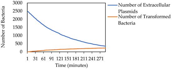 The simulated numbers of transformations increased at a decreasing rate, occurring at a frequency of ≈0.0004 at first, as observed by Lorenz and Wackernagel [42], and decreasing in frequency as the number of bacteria without a plasmid decreased (Figure 5). The simulated degradation of extra-cellular plasmids occurred at a frequency of ≈0.006, as reported by Lorenz and Wackernagel [42].