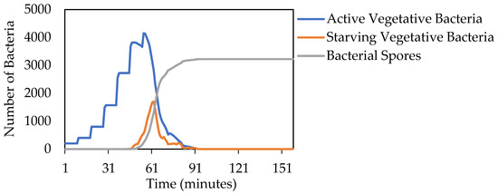 Simulated temporal dynamics of numbers of active vegetative bacteria, starving vegetative bacteria, and bacterial spores at 30 °C and 100% relative humidity.