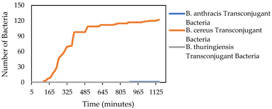As for the rate of production of transconjugant bacteria for each species, B. cereus formed almost the entirety the bacterial transconjugants, plateauing at around 120 bacteria about a third of the way through the simulation, with a very small amount of B. anthracis participating in conjugation near the end of the simulation (1–2 bacteria) (Figure 10). As B. thuringiensis was preset to not be able to conjugate, its rate of transconjugant production remained at zero for the duration of the simulation.