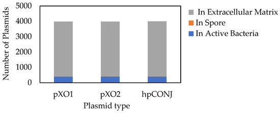 Even this limited conjugation between B. anthracis and B. cereus was enough to produce anthrax spores containing plasmids coding for anthrax toxins near the end of the time frame. Plasmid movement among B. cereus adequately allowed for the generation and movement of anthrax-related plasmids so that an anthrax outbreak was possible. At the end of the 20-h period of the simulation, the majority of all three plasmids, pXO1, pXO2, and hpCONJ, were present in the extracellular matrix (90% of plasmids), meaning that they were not housed within a bacteria or spore (Figure 11). These results show that the majority of plasmids were lost from bacteria, through segregative loss, and deposited in the extracellular matrix as the simulation progressed. A small but significant number of plasmids were present in active bacteria (9.9%), and a very small percentage of plasmids were present in spores (0.13%). In the absence of B. thuringiensis conjugation, B. cereus can contribute heavily to conjugation events with B. anthracis.