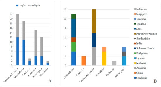 (A) Biogeographic distribution of single-strain Wolbachia infections and multi-strain Wolbachia infections within Polyrhachis hosts. The “Sundaland” and “Wallacean” groups are included here as separate categories to better distinguish their geography from the more northern parts of the Indomalayan realm. (B) Country distribution of the singly infected Polyrhachis samples. (C) Polyrhachis species distribution of the 34 singly infected samples. There were 21 different host species represented in this sample pool.