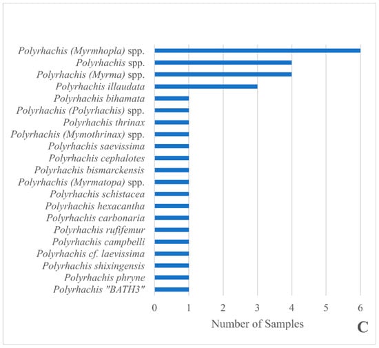 In past studies, specific ant species have been studied for their associations to Wolbachia [,], and the evolutionary association of Wolbachia was evaluated across the entire Formicidae family []. Additionally, Wolbachia has been studied in other social insects such as bees, termites, and wasps []. In one species-specific study, the diversity of Wolbachia was analyzed across the geographically diverse giant turtle ant species (Cephalotes atratus), and results suggested that Wolbachia diversity is affected by geography []. In a broader study that analyzed Wolbachia across Formicidae, the evolutionary origins of Wolbachia infection in ants were illuminated and the biogeographical origin of the symbiosis was inferred to be in Asia []. Our intention with this work, investigating Wolbachia infection across the Polyrhachis genus, is to further explore the notion that Wolbachia diversity can be impacted by geography, as well as the evolutionary association between host and microbe via phylogenetic and species level analyses.