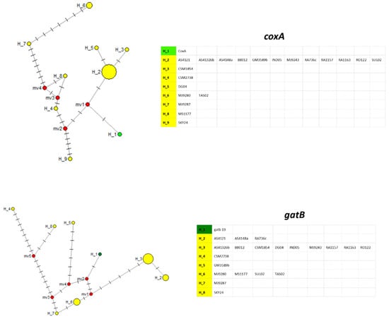 Haplotype network figures for all samples able to be assigned a sequence type. The haplotype size represents the frequency found, and black bars between haplotypes represent the numbers of nucleotide differences between haplotypes. Red dots (labelled “mv” and numbered) were added by the program as a hypothetical haplotype.
